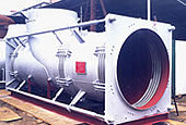 此類膨脹節(jié)的前部(通道端)有兩個工作波紋管,可以吸收來自彎管段產(chǎn)生的橫向位移;后部(平衡端)有一個平衡波紋管,它可以吸收來自直管段的軸向位移.當(dāng)彎管段產(chǎn)生橫向位移時,大拉桿上球螺母繞球面墊圈轉(zhuǎn)動,同時大拉桿承受內(nèi)壓的推力,因此該膨脹節(jié)常用于泵、罐、壓縮機(jī)、汽輪機(jī)出口處,以減少對上述設(shè)備的作用力。 四、安裝使用注意事項(xiàng):