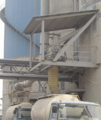 庫內(nèi)部分通過支架吊掛在水泥庫內(nèi)部,以10%的斜度放置,以使水泥料倉內(nèi)的水泥粉呈流態(tài)化(此高壓壓縮空氣由用戶自備羅茨風機或由廠內(nèi)壓縮空氣總管經(jīng)減壓后接入)。“出料連接槽”、“輸送斜槽”在水泥庫外按出料順序連接同樣以10%的斜度放置,正常使用時打開。“卸料閘門”用來控制散裝機裝車時的水泥落料狀態(tài);“斜槽風機”用來使輸送斜槽內(nèi)水泥物料流態(tài)化。散裝機為其主體設備,其下料頭伸縮長度為1.6米,以適應不同車型的裝車要求。本散裝機伸縮管下降至罐形容器入料口位置的停止及料裝滿時卸料閘門的關閉均為自動控制,下料頭的內(nèi)、外伸縮管間接除塵器,裝車時無粉塵飛揚。