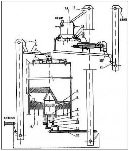 MF生料均化庫的生料采用分配器和六根斜槽呈輻射狀卸入庫內,基本形成水平料層,庫底是錐形,略向中心傾斜,中部有一中心混合室,中心室與庫壁之間的均化庫庫底分為6-14個充氣區(qū),每區(qū)設3條充氣斜槽和3個卸料孔,卸料時向兩相對區(qū)輪流充氣,在卸料中上方出現(xiàn)多股漏斗凹陷,漏斗沿直徑排成一列,隨充氣的交換而旋轉角度,這樣不但產生重力混合,而且生料從庫底卸入中心室后,中心室底部連續(xù)充氣,使生料又獲一次均化,由于這種庫的均化原理是以料流重力混合為主要手段,所以電耗極省,能耗僅為0.432~0.576Mj/t,均化值H可達7-10,該系統(tǒng)具有高效節(jié)能,基建投資低和操作管理簡便等優(yōu)點。